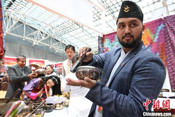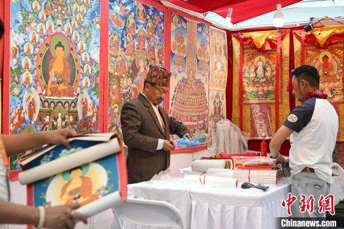 圖為拉薩進(jìn)口商品展覽會(huì)現(xiàn)場,尼泊爾商人介紹、推銷自己的商品。中新社記者 貢嘎來松 攝