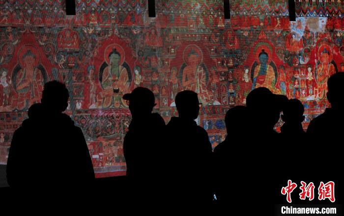 圖為觀眾在西藏博物館內(nèi)欣賞阿里古格經(jīng)典壁畫數(shù)字化成果展。李林 攝