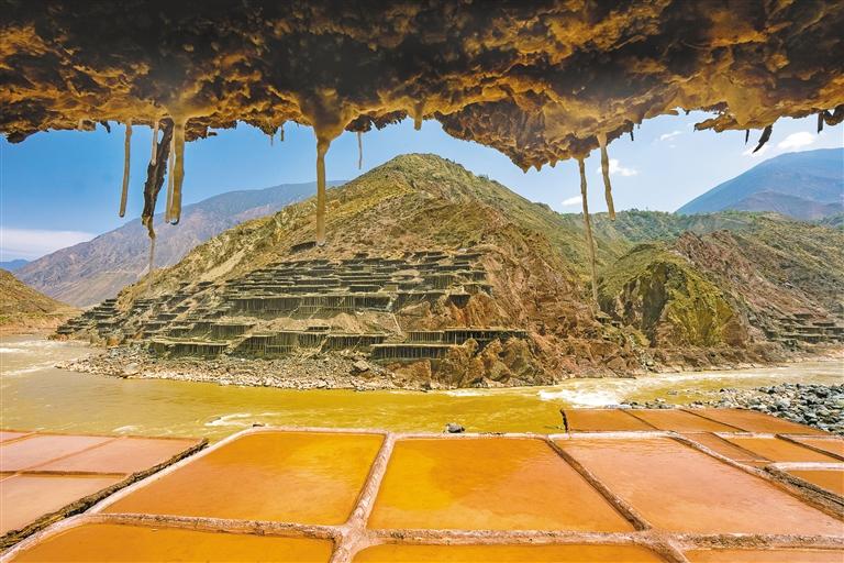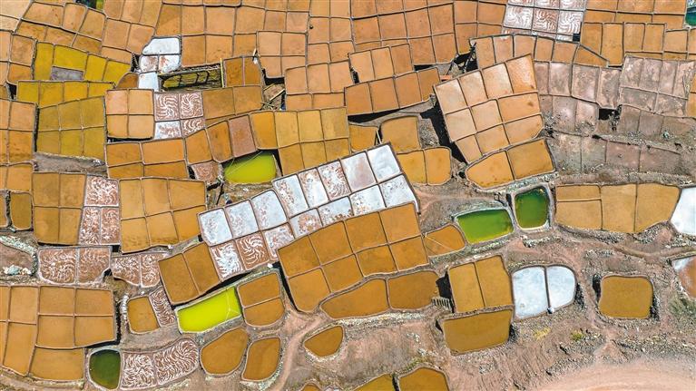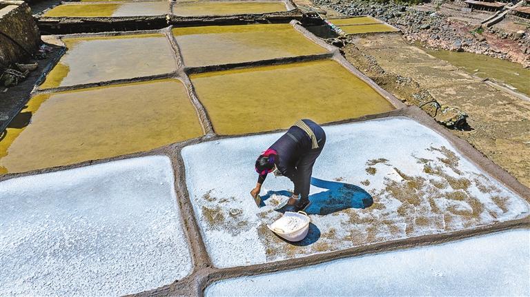 鹽田里,60歲的乃柯正和丈夫一起用木拍夯實(shí)鹽田。“現(xiàn)在用泵抽水輕松多了,但拍鹽田的手藝不能丟?!崩先说脑捳Z中,既有對(duì)科技的接納,也有對(duì)傳統(tǒng)的堅(jiān)守。鹽田下方,鹽晶垂落成簾,在山風(fēng)拂動(dòng)下閃爍微光,仿佛在訴說著什么。一塊塊鹽田如同一面面鏡子,既映照出千年文明的厚重,也折射著鄉(xiāng)村振興的希望。當(dāng)鹽民們輕掃鹽田,他們掃的不僅是晶瑩的鹽,更是一份在傳承與創(chuàng)新中守護(hù)的鄉(xiāng)愁。