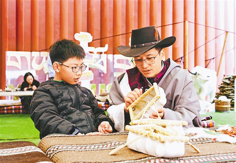 西藏牦牛博物館將牧區(qū)生活“搬”進(jìn)展廳。黑帳篷內(nèi)飄出酥油茶香,觀眾盤(pán)坐氈毯體驗(yàn)手工磨制糌粑。牧民手把手教授牦牛毛編織技藝,讓觀眾親身體驗(yàn)粗糙的牦牛毛在指尖捻轉(zhuǎn)成繩結(jié)。此外,雕版拓印和牛皮船制作體驗(yàn)區(qū)也備受關(guān)注。非遺傳承人現(xiàn)場(chǎng)演示古老的雕版印刷技藝,游客親手拓印吉祥圖案,帶走獨(dú)特的文化記憶。牛皮船的制作展示則讓觀眾近距離了解這一傳統(tǒng)水上交通工具的制作工藝,深刻感受藏族人民的生存智慧。