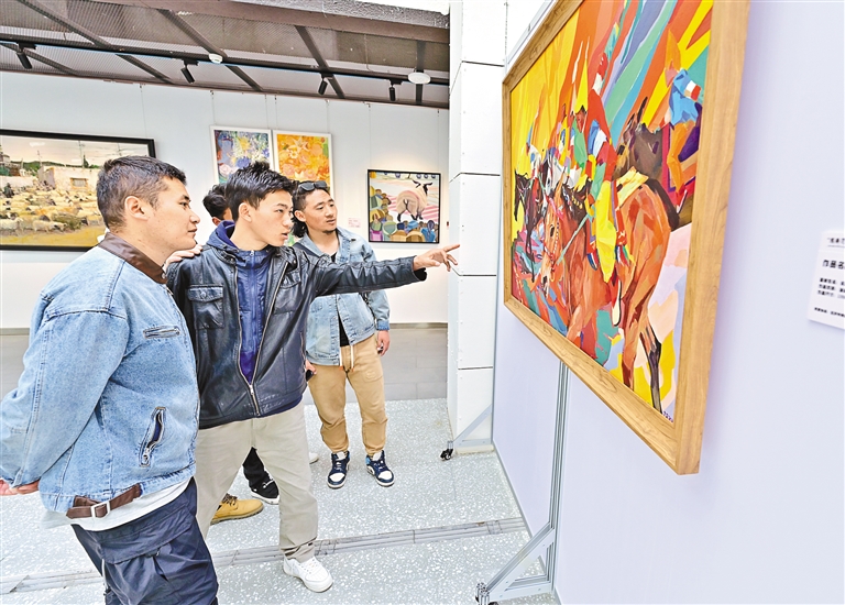 拉薩市首屆當(dāng)代女畫(huà)家美術(shù)聯(lián)展在西藏非遺博物館開(kāi)幕,市民群眾正在觀展。