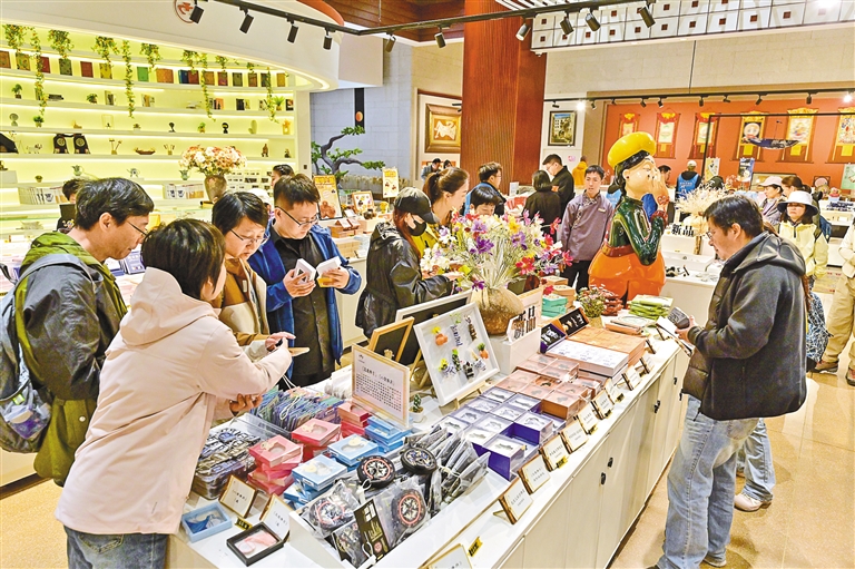 市民游客在西藏博物館內(nèi)選購(gòu)文創(chuàng)產(chǎn)品。