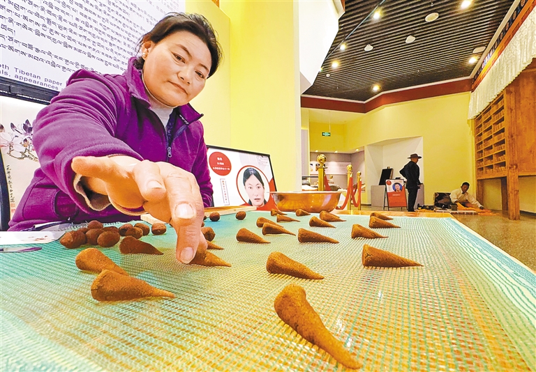 藏香制作非遺傳承人邊巴在西藏非物質(zhì)文化遺產(chǎn)博物館現(xiàn)場(chǎng)制作藏香。