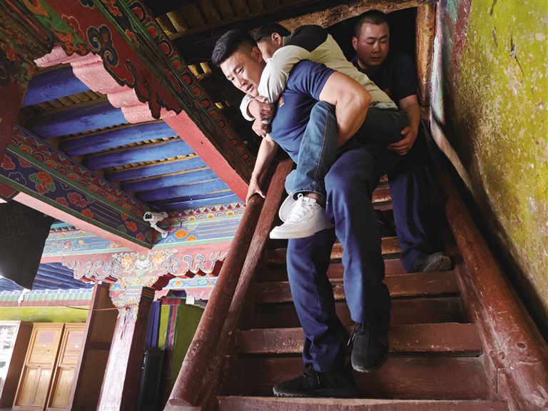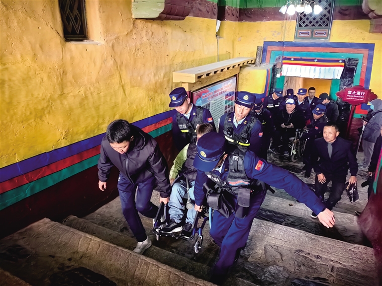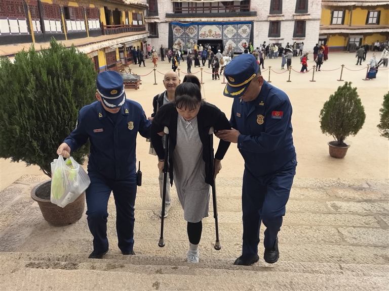 2024年,消防救援站接到一項(xiàng)特殊任務(wù)——幫助19名來自四川的殘疾人士參觀布達(dá)拉宮。面對(duì)15位肢體殘疾人和4位視力殘疾人,尤其是6位重度輪椅使用者和2位全盲者,消防員們沒有絲毫猶豫接下任務(wù)。布達(dá)拉宮海拔高、樓梯多、內(nèi)部道路狹窄陡峭,消防員們就用擔(dān)架抬、輪流背的方式帶領(lǐng)他們游覽。同時(shí),消防員化身“導(dǎo)游”,每到一處都詳細(xì)講解布達(dá)拉宮的歷史文化,耐心解答疑問,讓這些特殊游客感受到了溫暖與尊重。