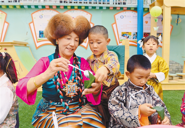 嘎瑪貢桑社區(qū)文藝隊(duì)隊(duì)員和拉薩市實(shí)驗(yàn)幼兒園東城分園的孩子一起包粽子。