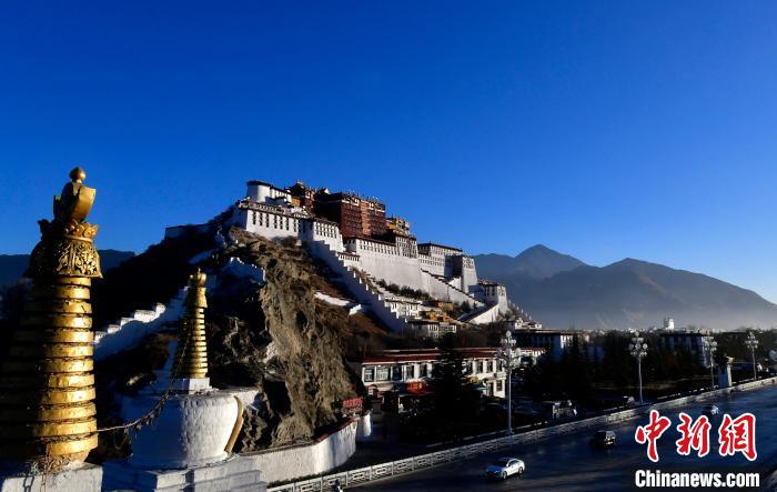 2025年1月1日,新年第一天,朝霞中的西藏拉薩布達拉宮。中新社記者 李林 攝