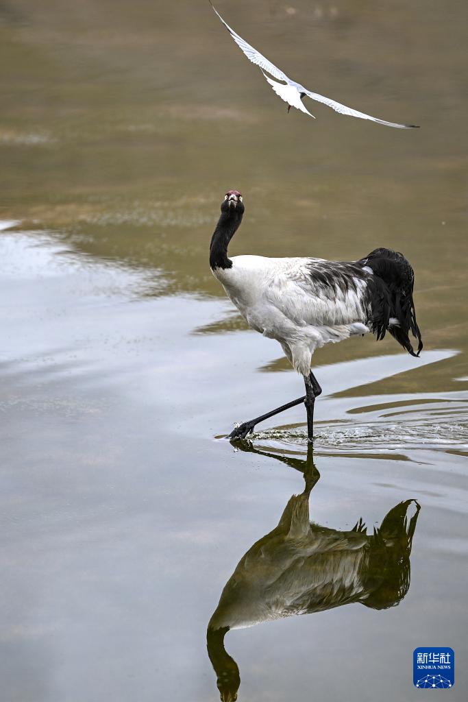 6月4日,在西藏那曲市申扎縣,一只黑頸鶴試圖驅(qū)趕鳥巢附近活動(dòng)的漁鷗。新華社記者 孫瑞博 攝