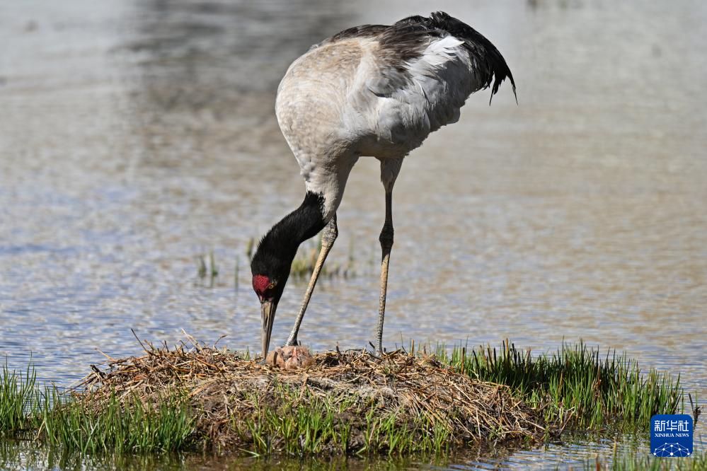 6月4日,在西藏那曲市申扎縣,一只黑頸鶴查看剛出生雛鳥的情況。新華社記者 孫瑞博 攝