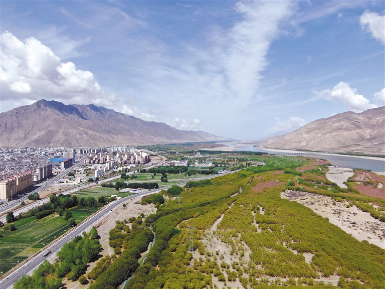 雅江中游“百里綠色生態(tài)長廊”與日新月異的山南市區(qū)和諧共生,展現(xiàn)出高原獨有的生態(tài)之美(無人機照片)。記者 武沛濤 攝