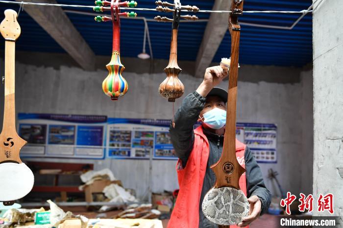圖為熱薩村村民白瑪塔木曲為扎念琴上色。貢確 攝