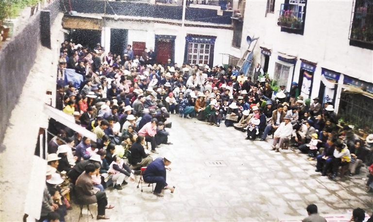 在當(dāng)時(shí)拍的另一張照片上,幾十位居民擠在過道里準(zhǔn)備投票?!澳菚r(shí)候院子小,選舉時(shí)得側(cè)著身子站?!钡录扛禄貞浀?,“院子窄小,雨天積水,但絲毫不影響大家參與社區(qū)事務(wù)的熱情?!闭掌囊唤?,13歲的普布普赤正躲在母親身后好奇張望,如今她41歲,已成長(zhǎng)為大院的戶長(zhǎng)。