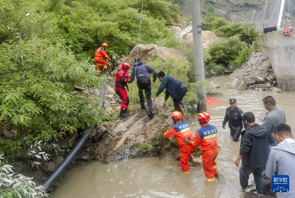 7月8日,西藏消防救援總隊救援人員在救災(zāi)現(xiàn)場搭建救援通道。新華社發(fā)(徐達富攝)