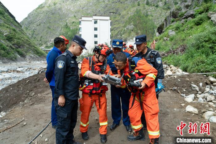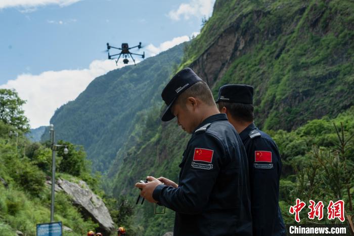 圖為9日,西藏移民管理警察與西藏消防等救援力量,操作無人機(jī)了解現(xiàn)場(chǎng)情況。肖富貴 攝