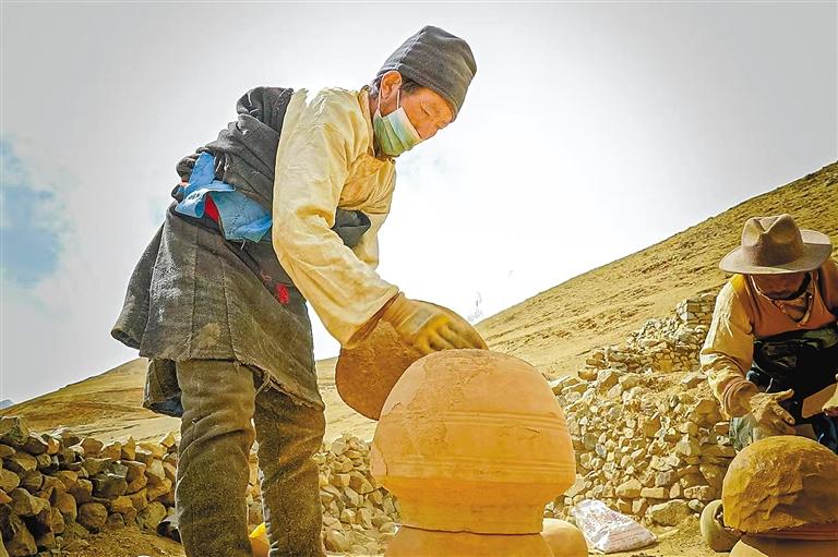 彭崗陶器制作工序繁復(fù),需歷經(jīng)取土、運(yùn)輸、粉碎、塑型、曬干、上水、燒制、成型、上漆(釉)等9道流程。僅取土環(huán)節(jié)便大有門(mén)道。年幼的桑珠緊隨舅舅,攀上海拔4475米的扎拉山山頂,在那處獨(dú)特土源地采擷優(yōu)質(zhì)黏土。