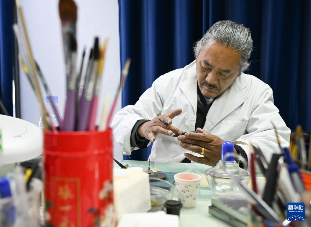 布達拉宮貝葉經實驗性修復小組實驗室工作人員對用于貝葉修復的顏料進行研磨處理(5月25日攝)。新華社記者 旦增尼瑪曲珠 攝?