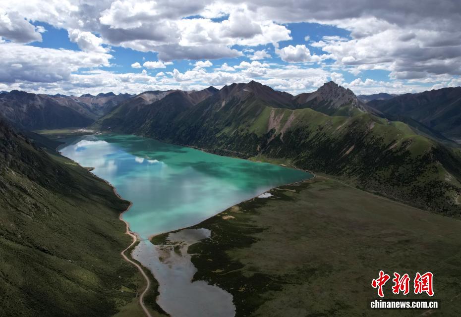 7月21日,嘉乃玉錯景色。嘉乃玉錯國家濕地公園位于西藏那曲市嘉黎縣境內(nèi)。夏日,嘉乃玉錯碧波蕩漾,湖邊綠意盎然,在藍天白云映襯下,景色如畫。(無人機照片)中新社記者 李林 攝