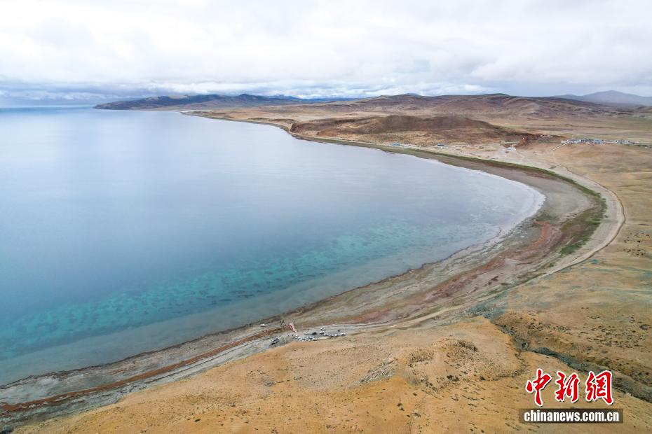 7月22日,游客游覽拉昂錯。瑪旁雍錯與拉昂錯位于西藏阿里地區(qū)普蘭縣境內(nèi),兩湖僅有一堤之隔,卻擁有不同的地理特征和咸淡水之分,因而分別被譽為“圣湖”與“鬼湖”。每年夏天,兩湖與附近的岡仁波齊一道,吸引眾多游客前來賞景游覽。(無人機照片)中新社記者 張祥毅 攝