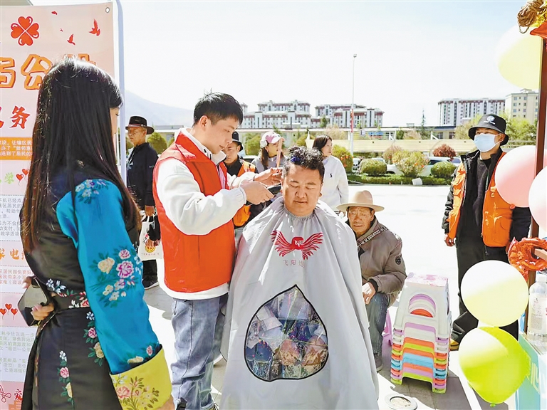 社區(qū)能人為群眾免費(fèi)理發(fā)。