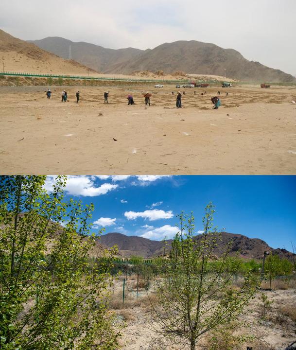 這是一張拼版照片。上圖為西藏山南市貢嘎縣境內拍攝的“先造后補工程”(2021年攝);下圖為西藏山南市貢嘎縣境內拍攝的拉薩南北山造林綠化(貢嘎段)(2025年4月24日攝)。新華網(wǎng) 旦增努布 攝