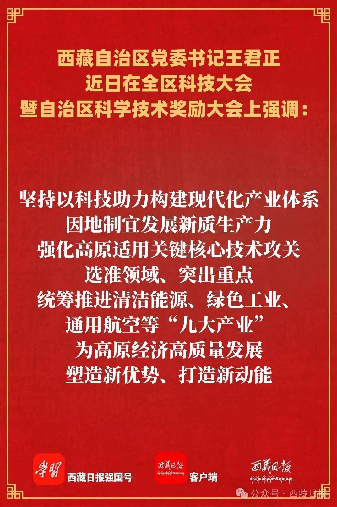 近日,全區(qū)科技大會暨自治區(qū)科學技術獎勵大會在拉薩召開,自治區(qū)黨委書記王君正出席并講話。他強調,要深入貫徹落實習近平總書記關于科技創(chuàng)新、西藏工作的重要指示和新時代黨的治藏方略,加快推動科技事業(yè)發(fā)展,為社會主義現代化新西藏建設提供堅實科技支撐。