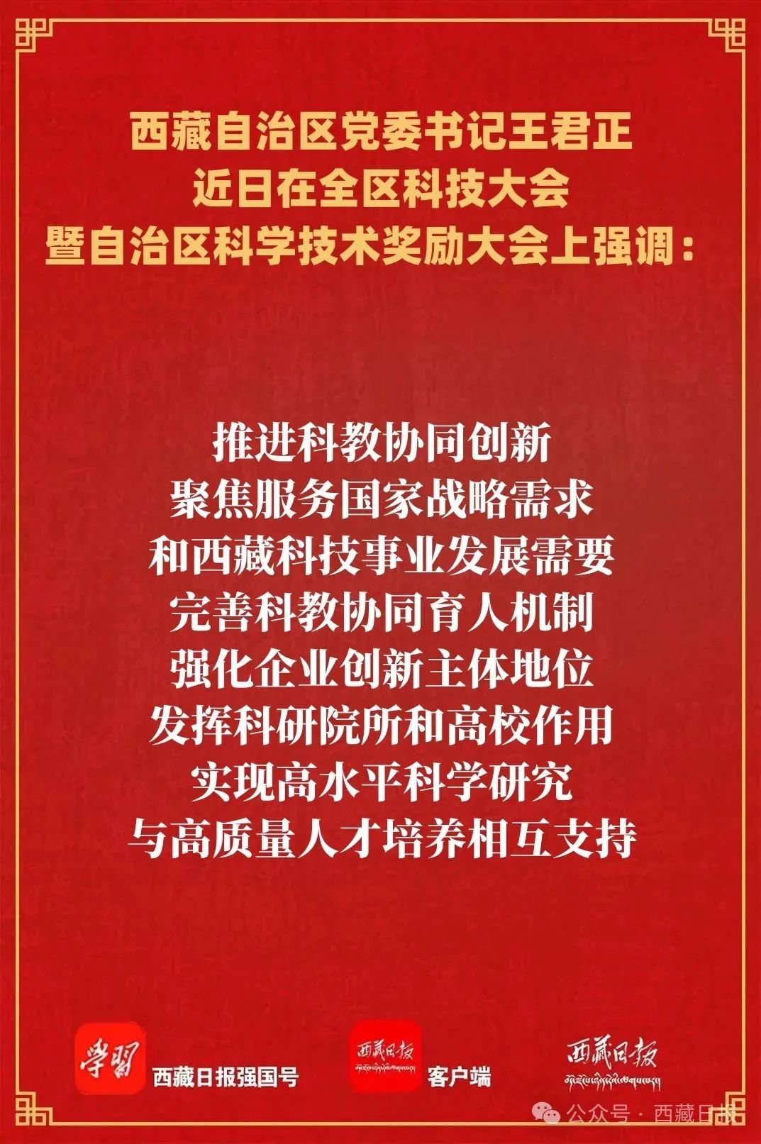 王君正代表自治區(qū)黨委、政府,向全體獲獎人員和單位表示祝賀,向廣大科技工作者為西藏長治久安和高質量發(fā)展作出的積極貢獻致以崇高敬意和衷心感謝。他指出,黨的十八大以來,以習近平同志為核心的黨中央高度重視科技事業(yè)發(fā)展,習近平總書記從黨和國家發(fā)展戰(zhàn)略全局的高度,對科技創(chuàng)新進行頂層謀劃和系統部署,有力推進科技自立自強,我國科技事業(yè)取得歷史性成就、發(fā)生歷史性變革。2024年6月,習近平總書記在全國科技大會、國家科學技術獎勵大會、兩院院士大會上發(fā)表重要講話,為做好新時代科技工作進一步指明了前進方向、提供了根本遵循。全區(qū)各級各部門要認真貫徹落實習近平總書記重要指示精神,深刻認識科技創(chuàng)新是推動經濟高質量發(fā)展的核心動力、是實現人民高品質生活的現實需要、是建設社會主義現代化新西藏的戰(zhàn)略支撐,進一步增強責任感使命感緊迫感,加快推進科技創(chuàng)新,為推動西藏長治久安和高質量發(fā)展作出新貢獻。