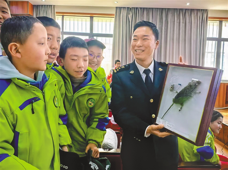 “同學(xué)們,這個(gè)圓柱形的赤褐色小蟲子,大家知道是什么嗎?它可是木材的‘隱形殺手’……”近期,在拉薩市第七中學(xué)課堂上,海關(guān)關(guān)員通過實(shí)物標(biāo)本展示,向120余名師生生動(dòng)講解檢疫性有害生物雙鉤異翅長(zhǎng)蠹的危害。活動(dòng)現(xiàn)場(chǎng),海關(guān)關(guān)員通過展示外來入侵物種標(biāo)本、講解“異寵”及外來物種入侵危害知識(shí),幫助同學(xué)們了解《中華人民共和國(guó)生物安全法》等相關(guān)法律法規(guī),引導(dǎo)青少年樹立生物安全意識(shí),積極守護(hù)生態(tài)安全。