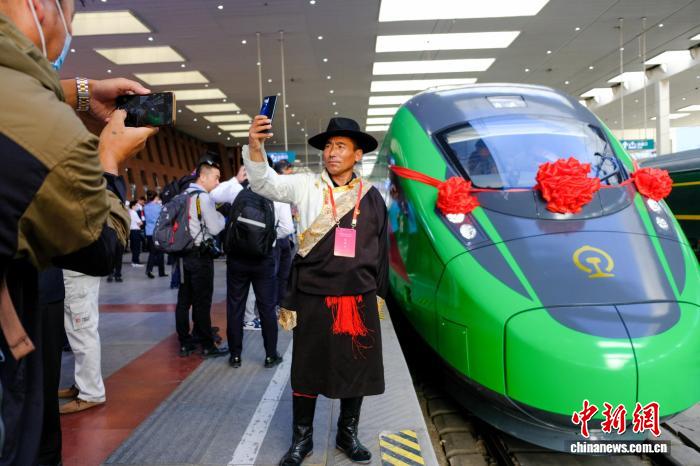 資料圖為2021年6月25日,西藏拉林鐵路開通運營,民眾在拉薩火車站與復興號拍照留念。當日,斯朗旺扎系首發(fā)司機。中新網(wǎng)記者 江飛波 攝