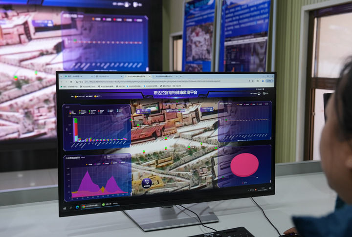 在布達(dá)拉宮監(jiān)測(cè)中心,工作人員正忙著通過(guò)數(shù)字化平臺(tái),實(shí)時(shí)監(jiān)控布達(dá)拉宮的“一磚一瓦”。