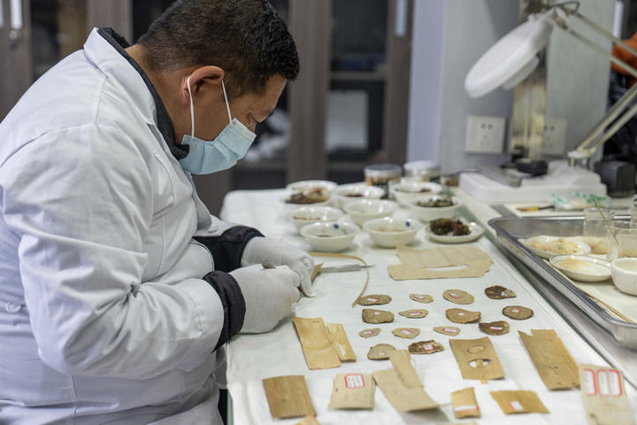 布達(dá)拉宮貝葉經(jīng)實(shí)驗(yàn)性修復(fù)小組實(shí)驗(yàn)室工作人員對(duì)貝葉進(jìn)行處理(2025年5月25日攝)。新華社記者 旦增尼瑪曲珠 攝