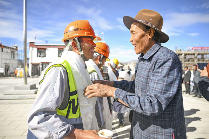 機(jī)器的轟鳴聲與悠揚的藏民族歌曲交織在一起,村民們依次向援建者獻(xiàn)上潔白的哈達(dá)、斟滿飄香的酥油茶,還有村民用大拇指蘸著白色的糌粑在他們身上點個指印,宛如一個個真誠的“點贊”,場景溫暖感人。