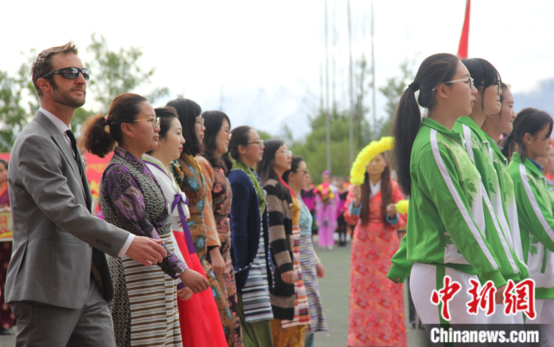 2017年5月11日,西藏大學(xué)舉行第二十八屆田徑運(yùn)動(dòng)會(huì),數(shù)十名外籍留學(xué)生和外籍教師參加了開幕式。圖為開幕式中旅游與外語學(xué)院方隊(duì) 劉蔭 攝