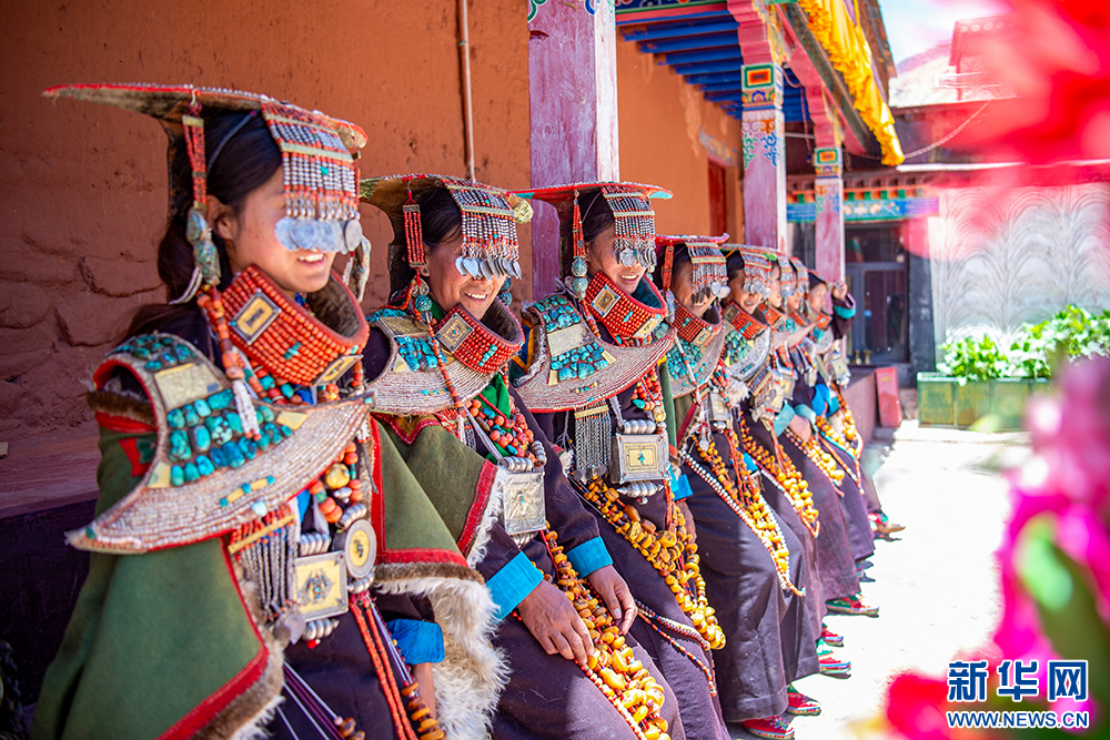 身著“普蘭服飾”的普蘭縣科迦村村民(6月10日攝)。“普蘭服飾”,主要由袍子、披風(fēng)、頭飾、項(xiàng)鏈、腰帶、耳墜、靴子組成。其中最精美、最獨(dú)特的為婦女服飾,外形設(shè)計(jì)如同孔雀開屏,被譽(yù)為“孔雀”服飾,一套重達(dá)20多公斤,裝飾有黃金、白銀、蜜蠟、珊瑚、綠松石等。新華網(wǎng) 旦增努布 攝