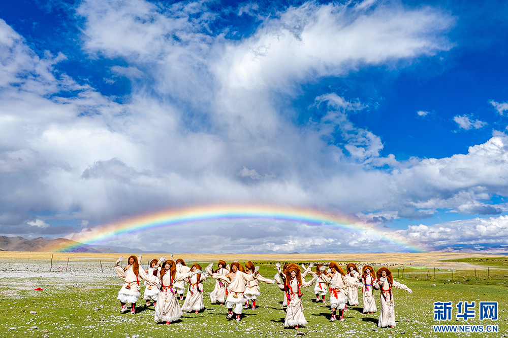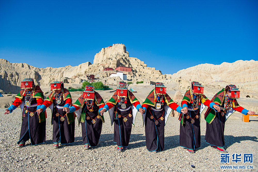 札達(dá)縣群眾在古格王國遺址腳下表演“宣舞”(6月12日攝)?!靶琛笔俏鞑匕⒗锩耖g傳統(tǒng)舞蹈,融合藏戲、舞蹈、說唱等傳統(tǒng)民間藝術(shù),內(nèi)容涵蓋禮儀、風(fēng)俗、節(jié)慶等。2008年,被列入國家級非物質(zhì)文化遺產(chǎn)名錄。新華網(wǎng) 旦增努布 攝