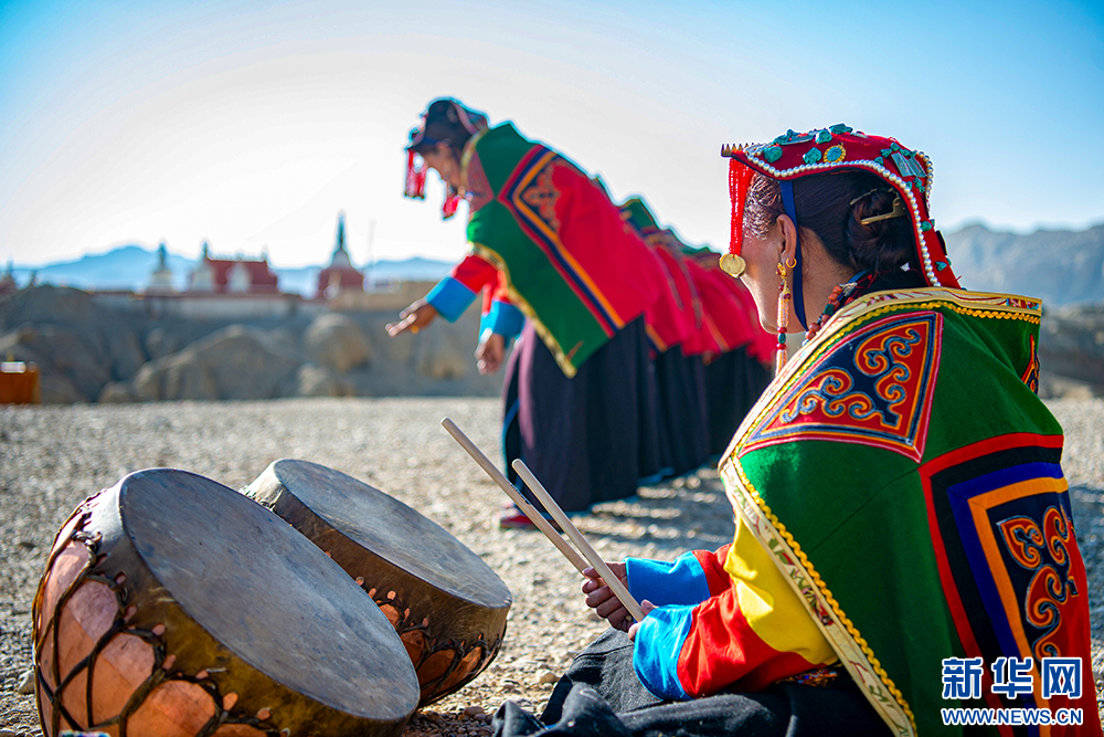 自治區(qū)級“宣舞”非遺傳承人央金(右)在古格王國遺址腳下伴奏鼓樂(6月12日攝)。新華網(wǎng) 旦增努布 攝
