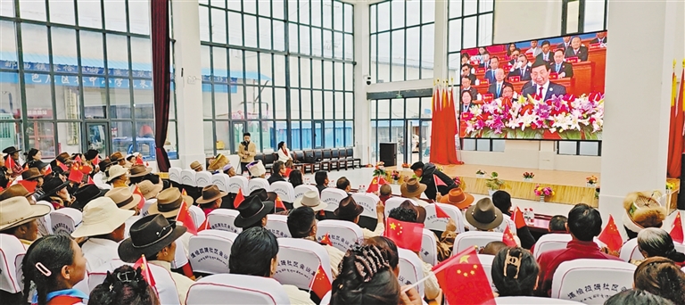 海拔5373米的浪卡子縣普瑪江塘鄉(xiāng)干部群眾通過(guò)多種形式收聽(tīng)收看大會(huì)盛況,共同見(jiàn)證這一重要的歷史時(shí)刻。普瑪江塘鄉(xiāng)黨委書(shū)記多吉旺久說(shuō):“60年來(lái),普瑪江塘鄉(xiāng)從過(guò)去靠天吃飯到如今靠科技吃飯,巨大的變化離不開(kāi)黨中央的親切關(guān)懷和黨的民族政策,我們一定銘記黨的恩情,永遠(yuǎn)聽(tīng)黨話、感黨恩、跟黨走。”
