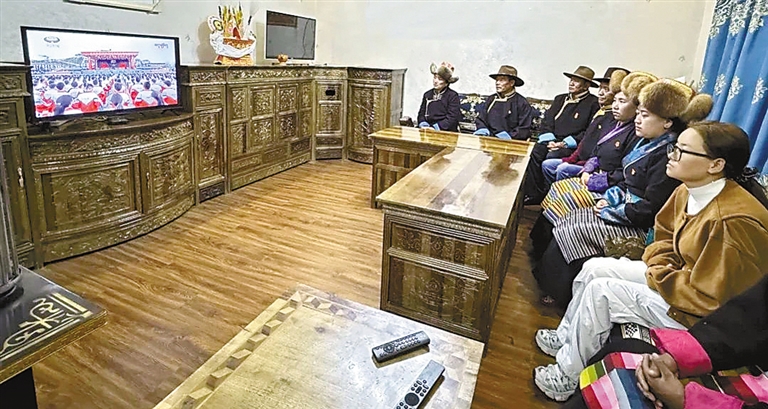 人民銀行日喀則市分行駐昂仁縣日吾其鄉(xiāng)日蘇村、西嘎村、普夏村、措嘎村、央曲村工作隊(duì),組織村“兩委”班子、黨員干部、群眾集中收看了慶祝西藏自治區(qū)成立60周年大會(huì)實(shí)況直播,共同見(jiàn)證了這一重要?dú)v史時(shí)刻。觀看過(guò)程中,大家心情激動(dòng),普夏村老人扎西表示:“以前怎么都不敢想,坐在家里就能看到拉薩的場(chǎng)景,在中國(guó)共產(chǎn)黨的領(lǐng)導(dǎo)下,我現(xiàn)在過(guò)上了以前想也不敢想的幸福生活,相信以后的生活會(huì)越來(lái)越好!”