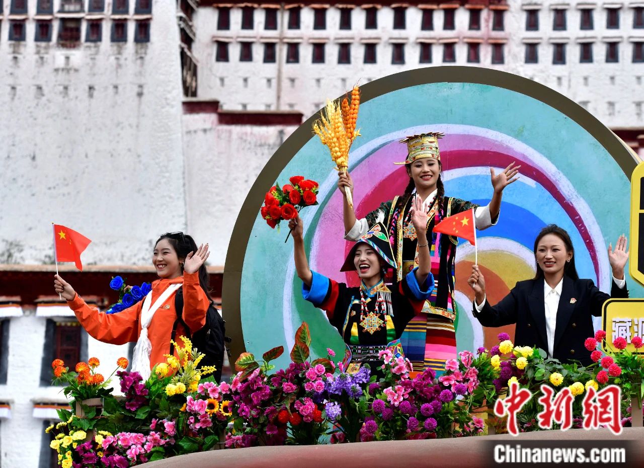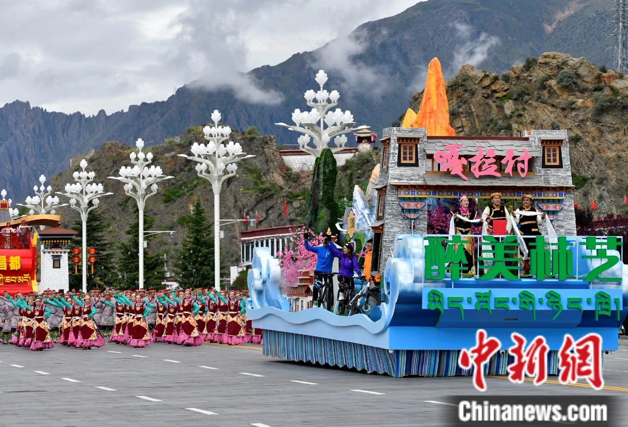 圖為西藏自治區(qū)成立60周年慶祝大會中的林芝彩車方隊(duì)。中新社記者 李林 攝