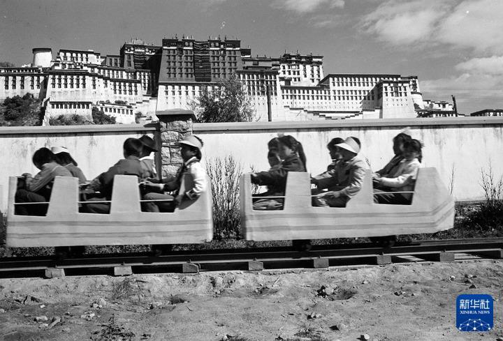1987年10月1日,在拉薩勞動(dòng)人民文化宮內(nèi)新建成的大型游樂場(chǎng)里,小朋友們?cè)诔俗妱?dòng)小火車。