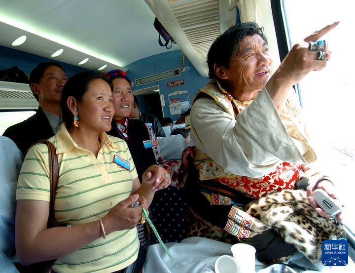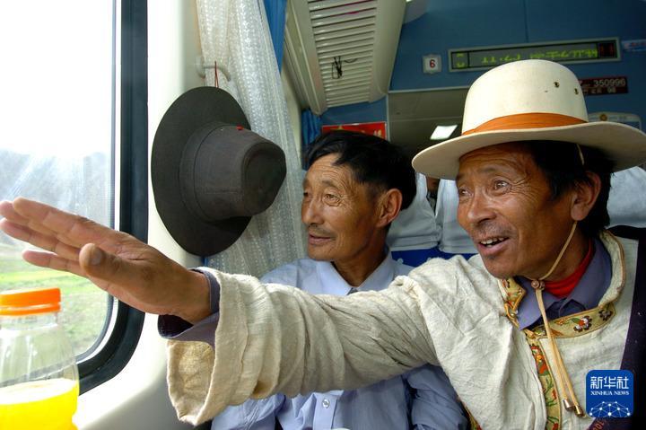 2006年7月1日,烏金(右一)乘坐的“藏2”次列車經(jīng)過自己家鄉(xiāng)安多時(shí),興奮地指向車外,向同伴介紹。