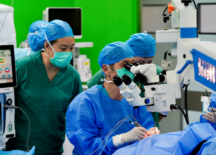魏文斌帶領(lǐng)的眼科專家團隊手術(shù)及帶教現(xiàn)場(施術(shù)者為史翔宇教授)