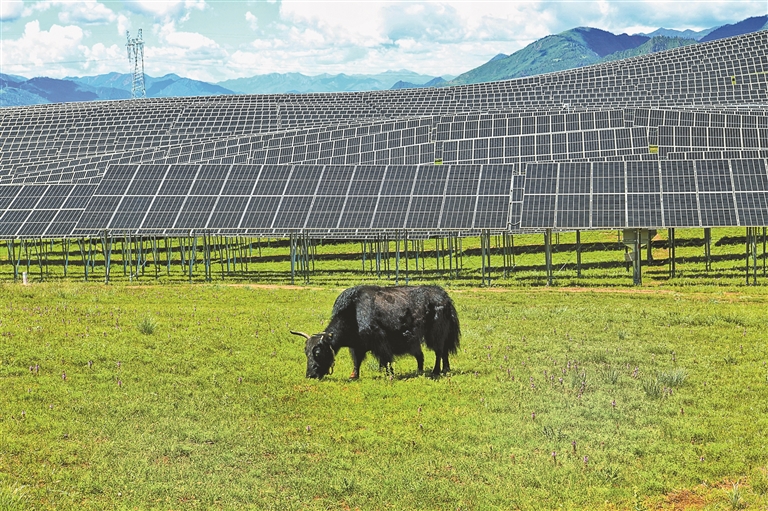 熱瓦鄉(xiāng)熱熱村是典型的牧業(yè)村,位于那曲市索縣的群山峻嶺之間。2023年12月,西藏開投集團(tuán)投資建設(shè)的50MW牧光互補(bǔ)儲能項(xiàng)目在這里并網(wǎng)發(fā)電,遠(yuǎn)遠(yuǎn)望去像是山坡上的“藍(lán)色湖泊”。牧民們每天會趕著羊群來這里放牧,陽光透過光伏板的縫隙灑在草地上,羊群在陰涼下自由覓食。在光伏板的“庇護(hù)”下,不僅山地植被可以免受烈日大風(fēng)的侵襲,還能對養(yǎng)殖的動物起到保護(hù)效果,在充分利用光能優(yōu)勢的同時(shí),為鄉(xiāng)村振興注入新動能,實(shí)現(xiàn)企業(yè)和農(nóng)牧民雙向受益。