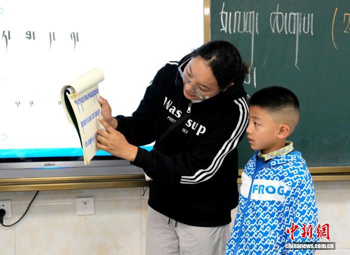 9月1日,拉薩市第一小學(xué)一年級(jí)二班,藏語(yǔ)文老師扎西央欽正在輔導(dǎo)學(xué)生。近日,西藏拉薩市秋季學(xué)期開學(xué),各項(xiàng)教學(xué)工作有序開展。中新社記者 李林 攝