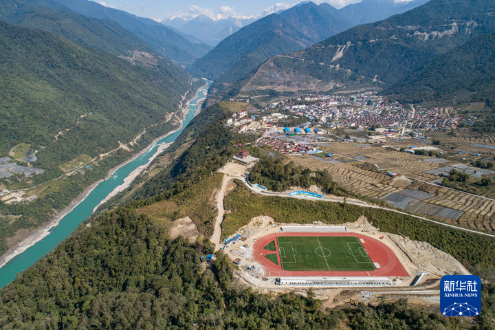 墨脫縣的11人制足球場(chǎng)位于雅魯藏布江邊(2021年2月13日攝,無(wú)人機(jī)照片)。新華社記者 孫非 攝