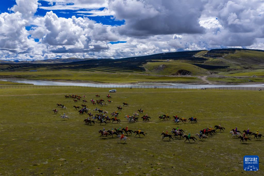 2025年那曲市恰青賽馬節(jié)上,騎手們?cè)趥鹘y(tǒng)大跑項(xiàng)目中馳騁(無(wú)人機(jī)照片,9月7日攝)。新華社記者 姜帆 攝