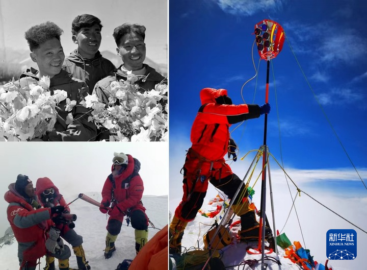 拼版照片:左上圖為1960年5月登上珠穆朗瑪峰峰頂?shù)闹袊?guó)登山隊(duì)隊(duì)員王富洲(右)、貢布(中)和屈銀華(資料照片,新華社發(fā));左下圖為2008年5月8日,北京奧運(yùn)圣火珠峰傳遞登山隊(duì)隊(duì)員羅布占堆(左)點(diǎn)燃第一棒火炬手吉吉手中的“祥云”火炬(新華社發(fā));右圖為2020珠峰高程測(cè)量登山隊(duì)隊(duì)員在珠穆朗瑪峰峰頂開(kāi)展測(cè)量工作(2020年5月27日,新華社特約記者 扎西次仁 攝)