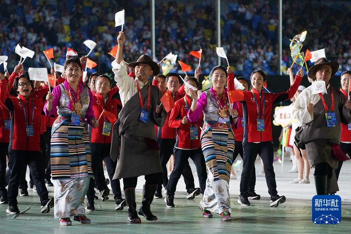 第十四屆全運(yùn)會(huì)開(kāi)幕式,西藏自治區(qū)體育代表團(tuán)在入場(chǎng)儀式上(2021年9月15日攝)。新華社記者 彭子洋 攝