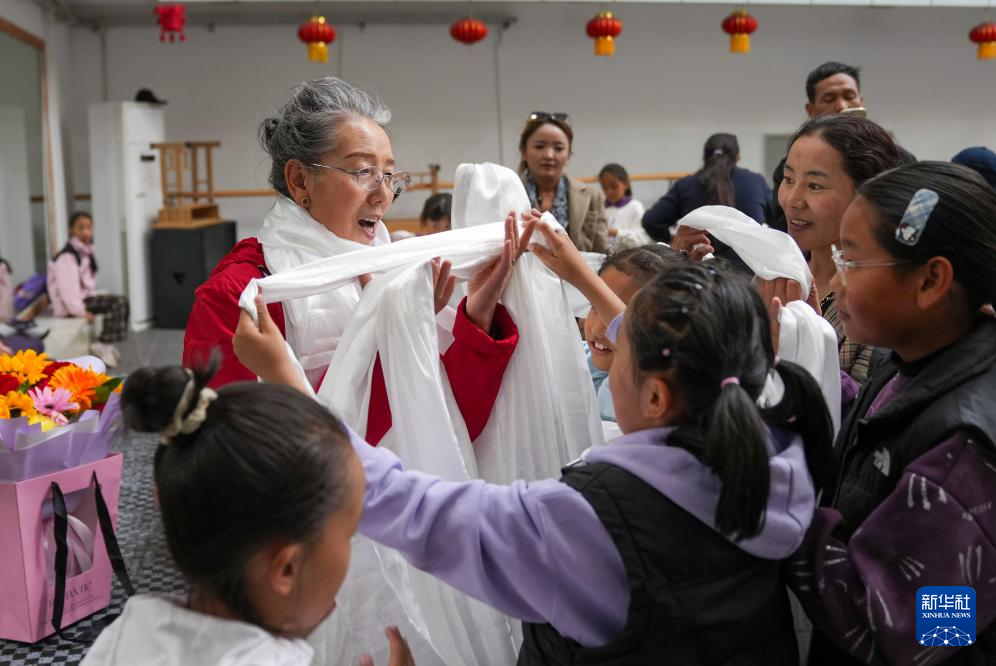 9月14日,孩子們給巴桑老師獻上哈達,送上遲到的教師節(jié)祝福。新華社記者 晉美多吉 攝