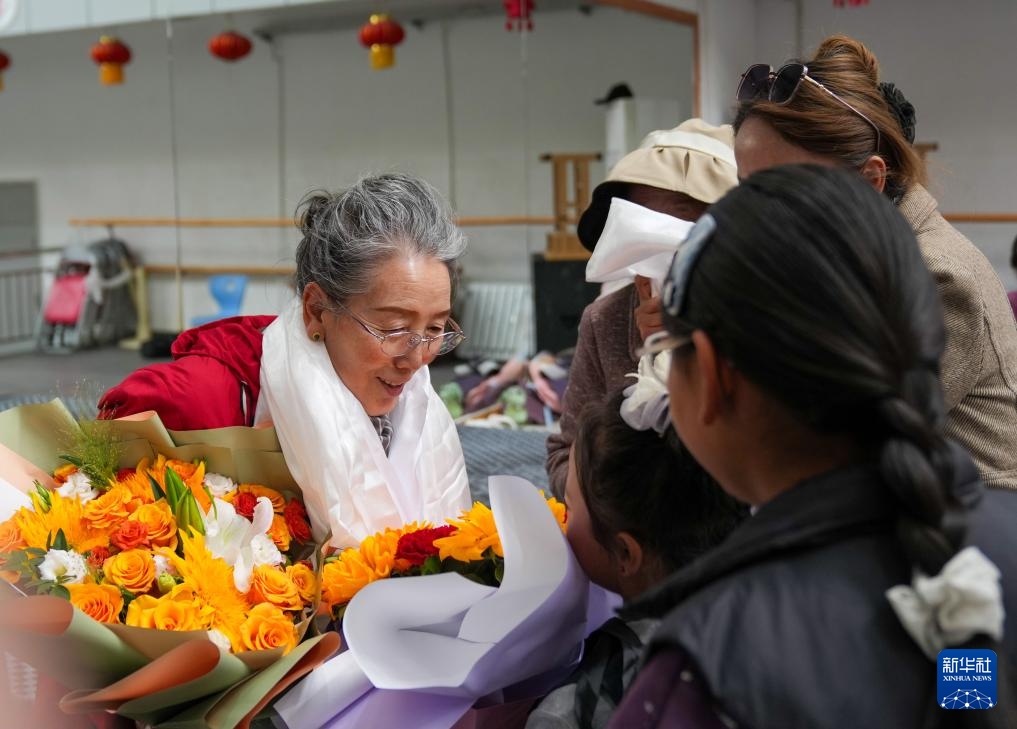 9月14日,學藏戲的孩子們在給巴桑老師獻花,送上遲到的教師節(jié)祝福。新華社記者 晉美多吉 攝