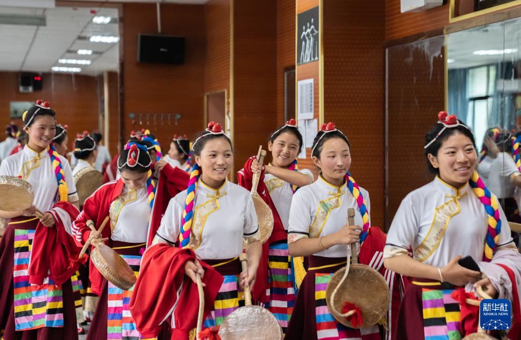 9月9日,在拉薩市第二中等職業(yè)技術(shù)學(xué)校,孩子們?cè)诰毩?xí)熱巴舞。新華社記者 晉美多吉 攝
