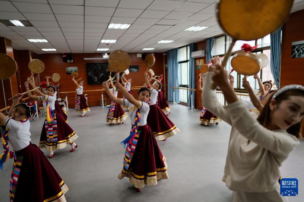 9月9日,在拉薩市第二中等職業(yè)技術(shù)學(xué)校,孩子們?cè)诰毩?xí)熱巴舞。新華社記者 張笑宇 攝